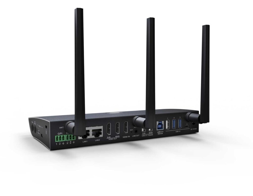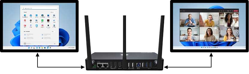 It connects laptops wirelessly to the two main screens and to existing USB devices in the room, such as video or sound bars, cameras, and speakerphones, for both wireless local presentations (BYOD) and online meetings (BYOM) via the preferred UCC platform, whether Microsoft Teams, Zoom, Cisco WebEx, Google Meet, or more.