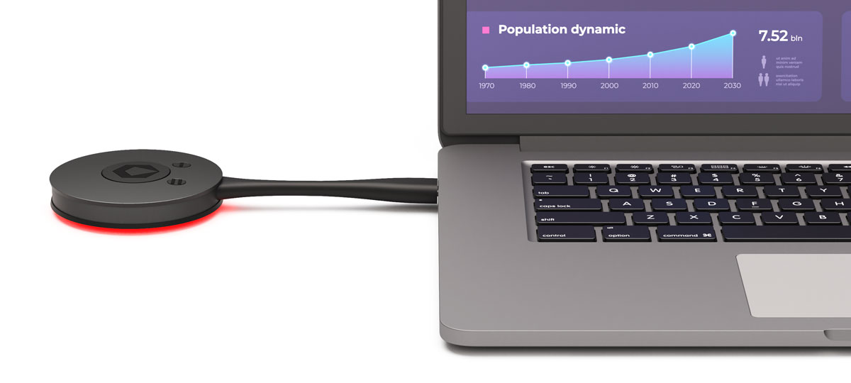 The dual-cam function allows you to offer remote online participants different perspectives by using two USB cameras alternately for BYOM meetings wirelessly on your laptop or, thanks to the dual-UCC function, also via USB cable on a stationary room PC.